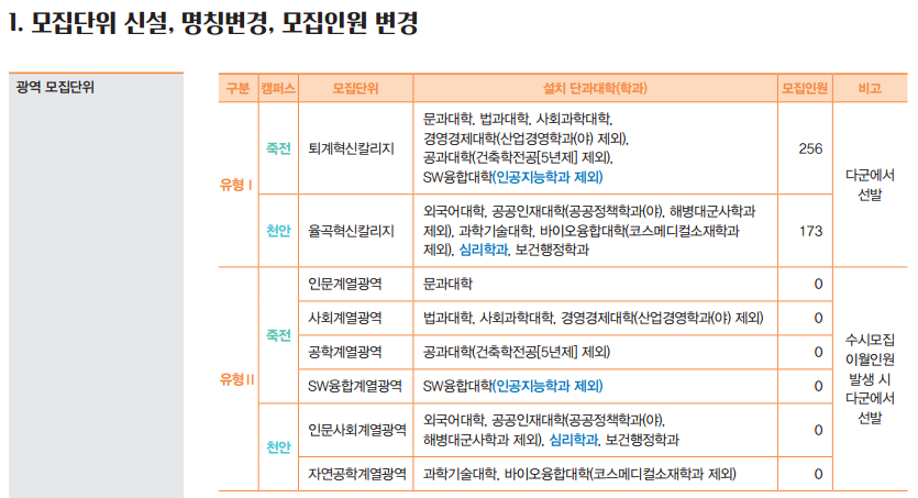 - 모집단위 신설 및 통합, 명칭 변경 다수 발생